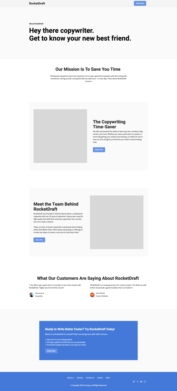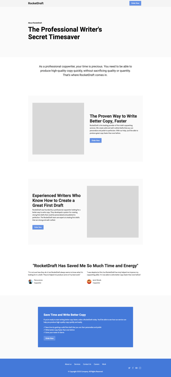 This draft will save you valuable time and jumpstart your project. You get clear and concise copy for seven sections: heading, problem, success, empathy, plan, testimonials, and benefits.